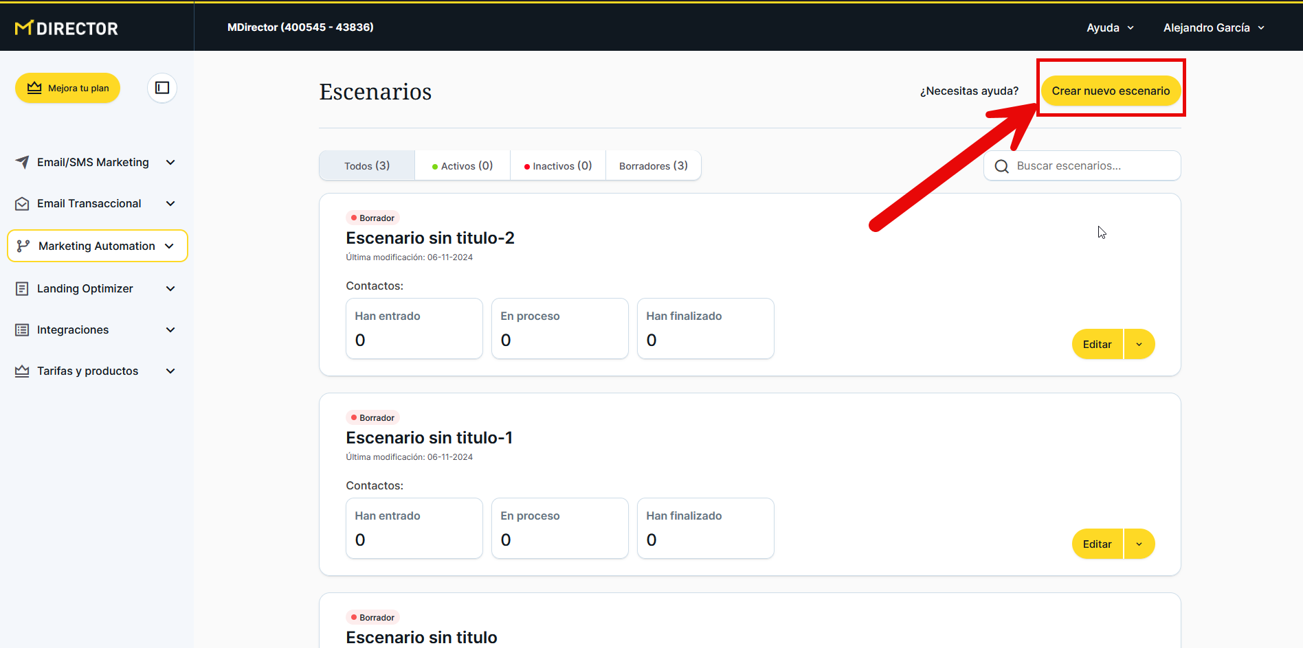 De igual forma que ocurre en el módulo de Email/SMS Marketing con la creación de envío y en el de Landing Optimizer con la creación de páginas de aterrizaje, en Marketing Automation hallamos en todos sus apartados -uno solo, en este caso- un botón amarillo destacado en la esquina superior derecha que dice «Crear nuevo escenario».