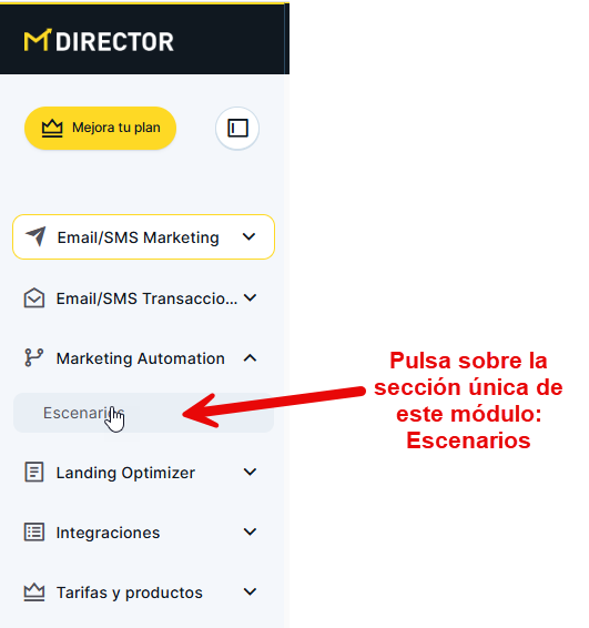 Para acceder a él, ve al menú lateral, ubicado en el lado izquierdo de tu pantalla, y, asegurándote de que este está descolapsado, clica sobre el título o la flecha a su derecha, lo que hará que se desplieguen las secciones del módulo, que, en este caso, es una sola: Escenarios. Para entrar al módulo, tendremos que viajar a este módulo clicando sobre su nombre y aterrizaremos en la página que contiene los escenarios creados.