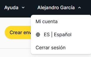 Mi Cuenta, Selección de Idioma y Salir de la app, siguen estando en el menú superior derecho, haciendo clic sobre tu nombre de usuario.