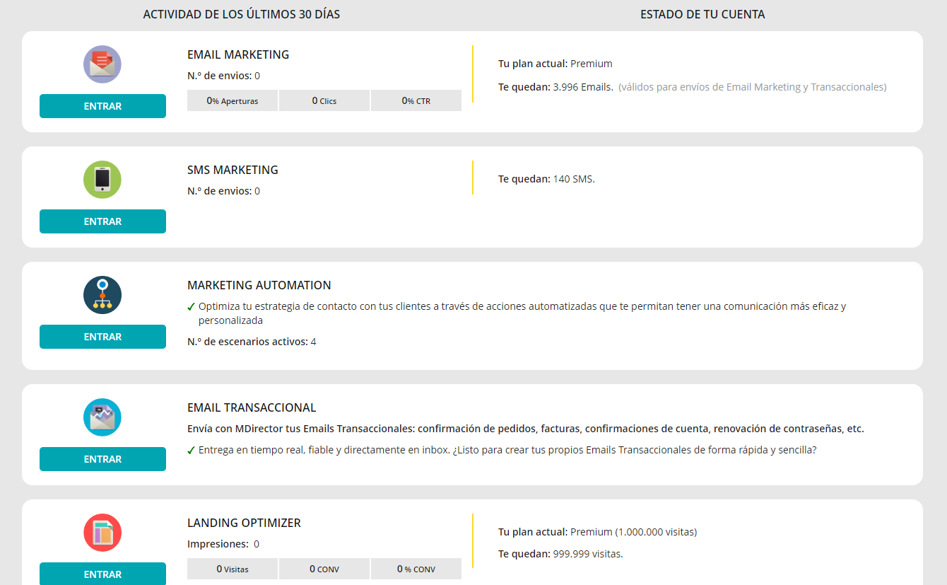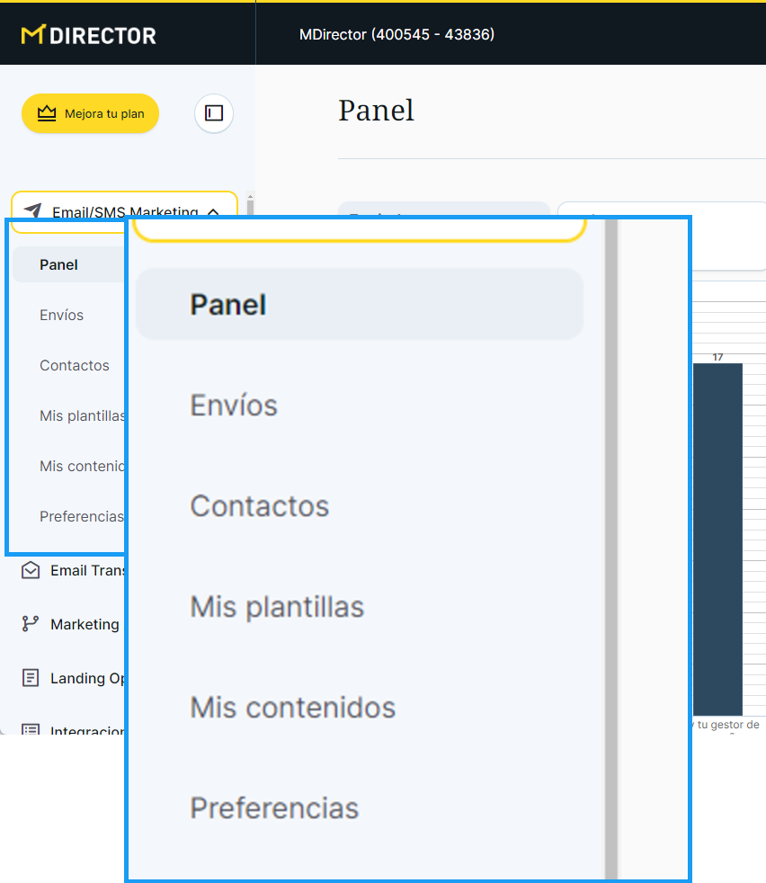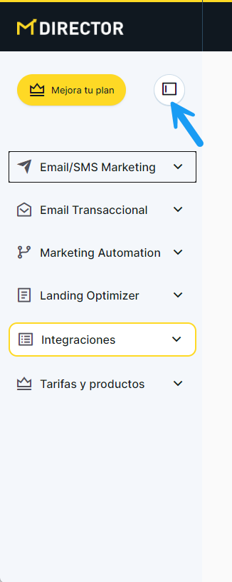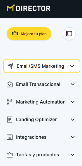 El acceso a los servicios de MDirector deja de realizarse desde la pantalla inicio a la que había que volver para cambiar de uno a otro, y se hace directamente en la barra lateral izquierda desplegando cada menú de servicio.