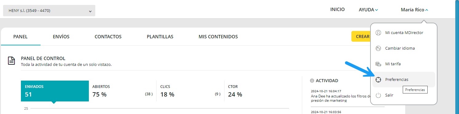 Preferencias de Email Marketing pasa a estar dentro del menú lateral izquierdo.
