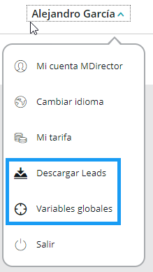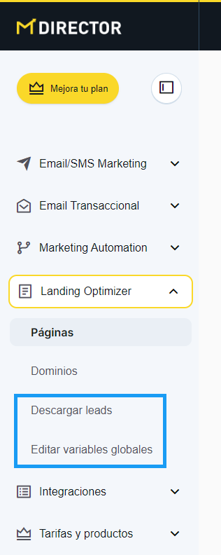 En Landing Optimizer: Descargar leads y Variables globales pasan de estar en el desplegable del nombre a estar en el menú lateral.