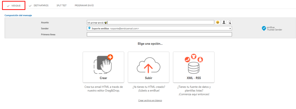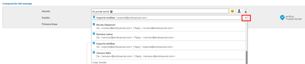 El primer campo para configurar es Remitente, puedes elegir uno de los que tienes configurados en tu cuenta haciendo clic en el menú desplegable o crear uno nuevo en «Crear remitente», encontrarás más información acerca del Sender y como configurarlo, aquí.