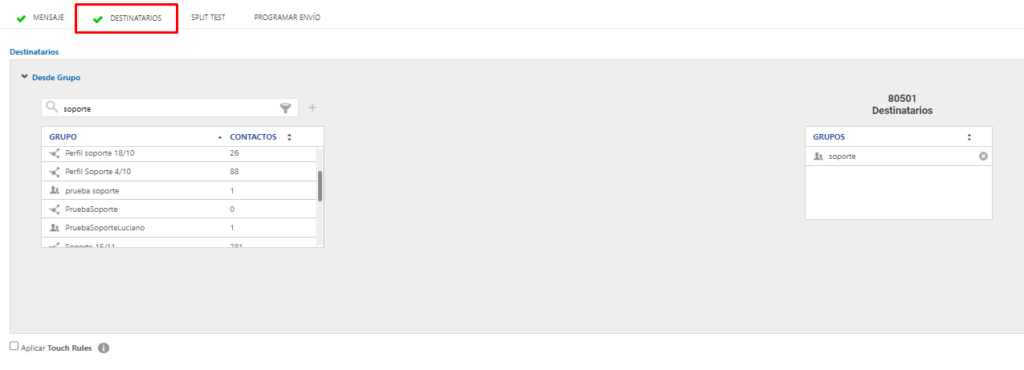 También podrás subordinar tu envío a Touch Rules (te servirán para limitar y suprimir envíos a determinados destinatarios de tu base de contactos para así, por ejemplo, evitar convertirnos en spam o generar que los contactos se desuscriban a nuestro contenido).