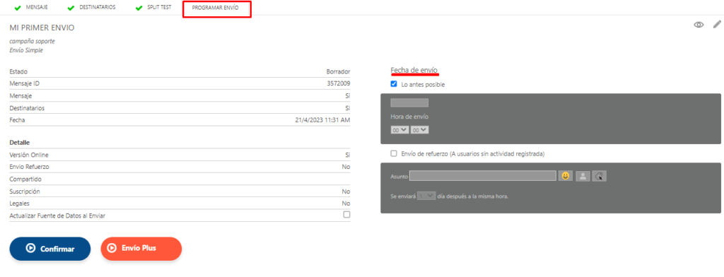 En esta solapa podrás configurar la fecha del envío para que salga inmediatamente o programarlo para más adelante.