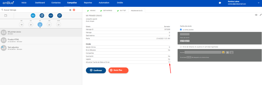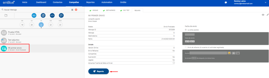También puedes elegir la opción de “Envío de Refuerzo” si deseas enviárselo nuevamente a los contactos que no hayan abierto la primera comunicación.