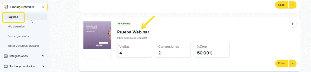 1. Accede al panel principal de la landing clicando el nombre de la Landing en el listado: