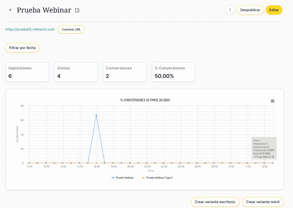 2. Una vez en el panel principal podrás ver las estadísticas generales de la landing como: visitas, impresiones, conversiones…