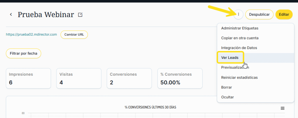 3. Para ver los leads a detalle, puedes acceder desde el menú que se encuentra en la esquina superior derecha (el que tiene tres puntos). Luego, haz clic en la opción «Ver leads»:
