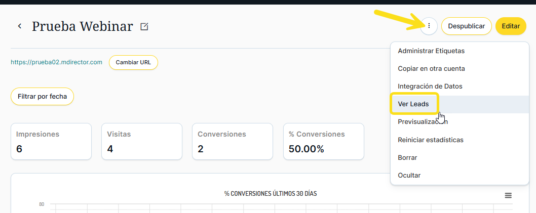 2. Una vez en el panel principal podrás ver las estadísticas generales de la landing como: visitas, impresiones, conversiones…