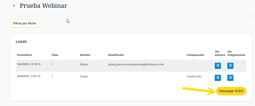 Desde esta opción se descargarán únicamente los leads de la landing en cuestión. En el caso de necesitar todos los leads de todas las landings, te indicamos cómo hacerlo en el siguiente artículo: https://mdtr.io/Hmy2K