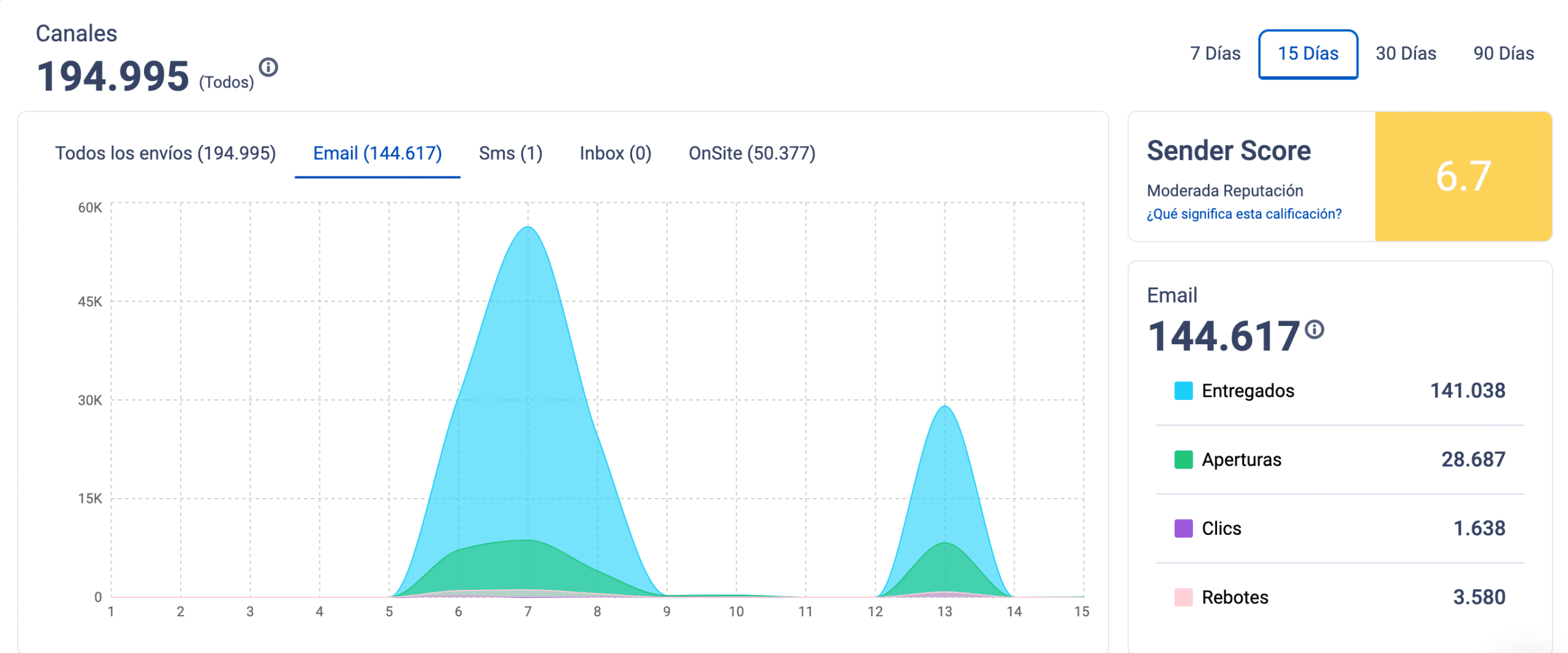 – A la derecha del gráfico se mostrará el recuadro de Sender Score, junto con los datos de rendimiento: cantidad de envíos, entregados, aperturas, clics y rebotes.