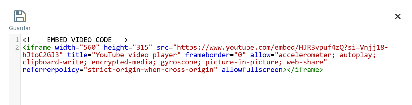 Inserta el código. Para insertar este código tienes que ir a la plataforma donde esté el video y buscar la opción «Compartir» y después buscar la opción de «Código/Insertar código». Te aparecerá un código parecido a este que tendrás que copiar en el elemento video que acabas de añadir: