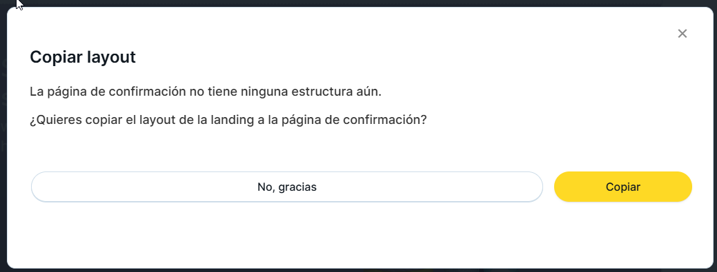 Si has utilizado una plantilla para crear la landing, ya tendrás una página de confirmación prediseñada, que podrás modificar según tus necesidades desde el propio editor. En cambio, si has creado tu diseño desde cero, MDirector te preguntará si deseas copiar ese diseño en la página de confirmación. Al hacerlo, se duplicarán todos los elementos del diseño original, excepto el formulario.