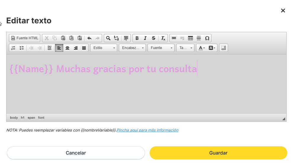 Si en la página de confirmación quieres hacer referencia a algún campo del formulario de la landing, sólo tienes que poner el nombre del campo (valor «etiqueta») entre 2 llaves iniciales y 2 llaves finales {{CAMPO}} , como se muestra en el siguiente ejemplo: