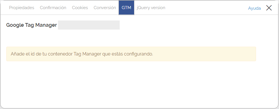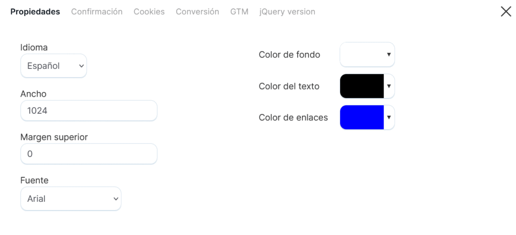 Cuando haces clic en «Propiedades», aparecen distintos apartados (propiedades, confirmación, aviso de cookies, conversión, Google Tag Manager y jQuery versión) que procederemos a explicarte.