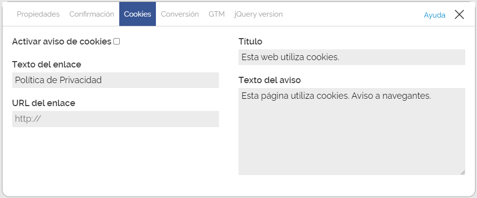 En este apartado puedes activar que le salte un Pop-up al usuario que visite una landing, donde se le avise del uso de cookies.