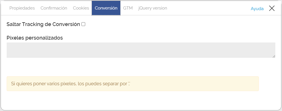 En este apartado podrás asignar píxeles personalizados para las conversiones que se obtengan en tu site. Un píxel de conversión es una imagen de 1×1 píxeles que colocas en tu web, es invisible, y se usa para poder contabilizar y rastrear las visitas a tu sitio.